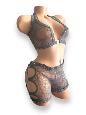 Includes bra, thong and shorts.