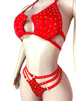 The bikini is bedazzled in red for a stylish and eye-catching look.