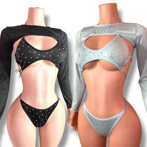 Chloe offers a bedazzled bra and thong set that also includes a long sleeve top.