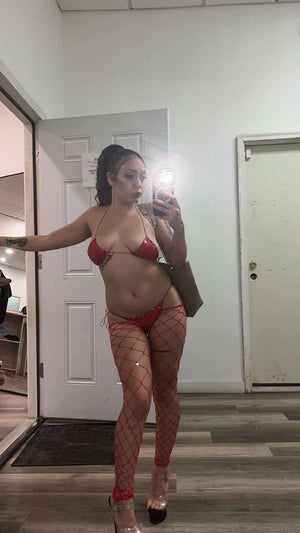 Unleash your inner fire with Sasha, the ultimate red latex bikini with stockings that fit like a glove. One size fits all, ensuring a perfect fit for all body types. Feel sexy and confident in Sasha, the perfect addition to your swimwear collection.