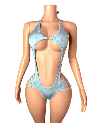 This baby blue romper features rhinestones and strategically placed cuts to highlight the body.